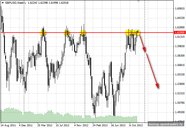 Очевидно, что причина кроется в сопротивлении 1.62, от которого фунт отбивался как в сентябре и октябре текущего года, так и целых 3 раза на протяжении года прошедшего