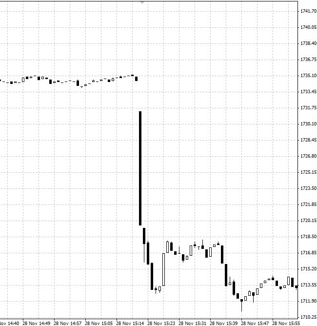 Есть мнение, что это был выход крупного игрока в период rollover gold comex. Это такой процесс, когда ликвидность активного контракта за некоторое время до истечения (часто за месяц до истечения) начинает переходить на более дальний. Считается, что во время таких ролловеров инструмент становится плохо прогнозируемый, и лучше не торговать.